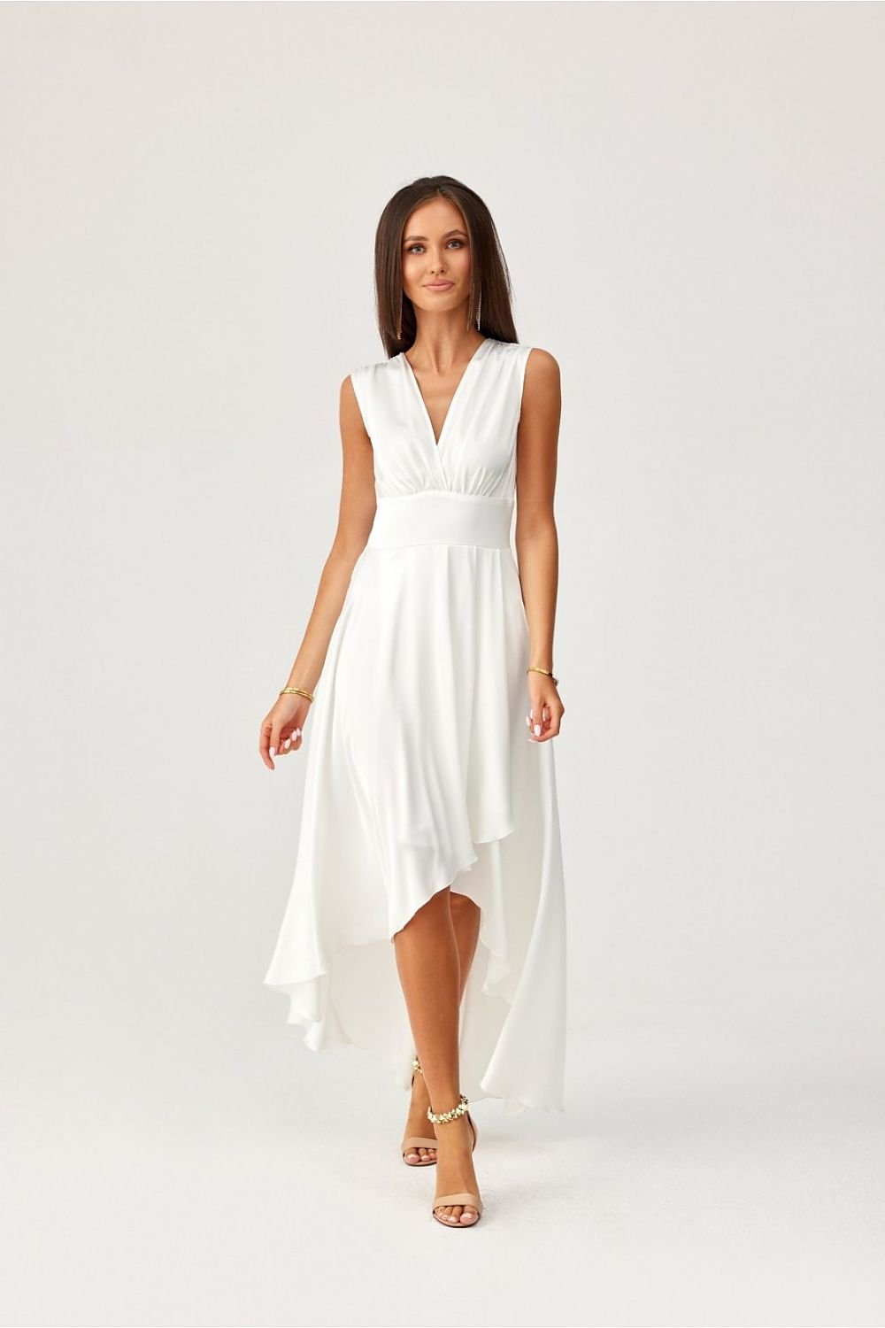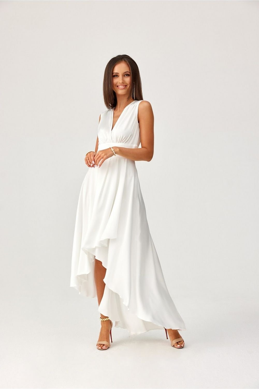 This maxi dress is made of shimmering satin fabric. The asymmetrical hem and plunging neckline lend it a subtle femininity, while the flared cut allows for freedom of movement. The evening dress features a beautiful envelope neckline that visually lengthens the silhouette and beautifully accentuates the bust. The wide waist tapers at the waist, beautifully highlighting a woman's assets. The maxi dress also features an asymmetrical cut that highlights the legs. The dress closes with a hidden zipper at the back. The product is made and sewn in Poland.