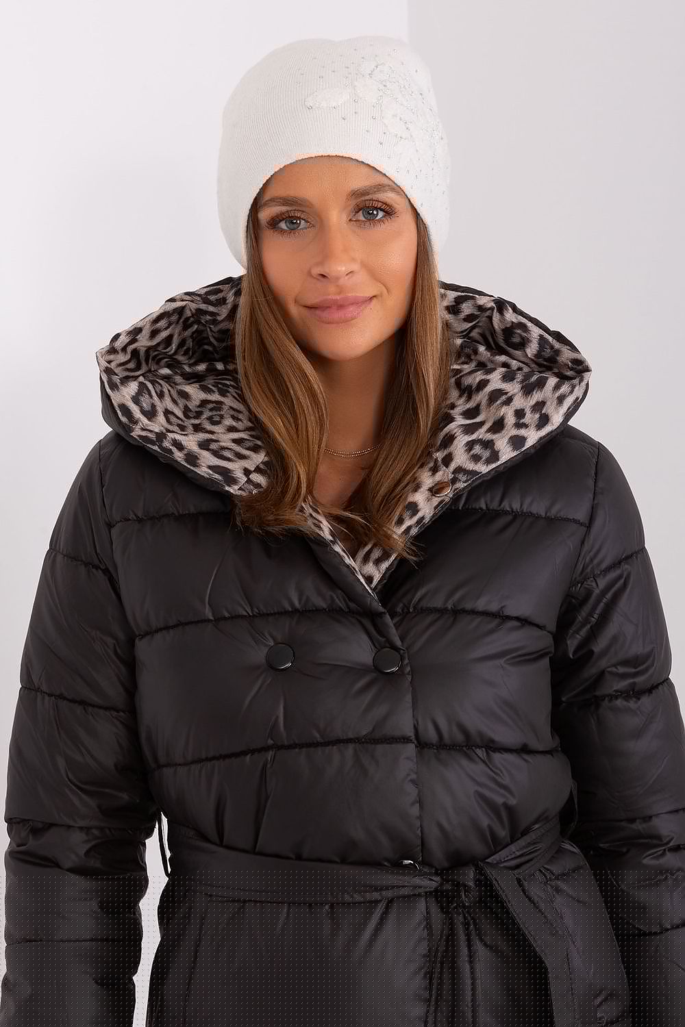 Warm women's winter hat made of cashmere with decorative rhinestone appliqué.