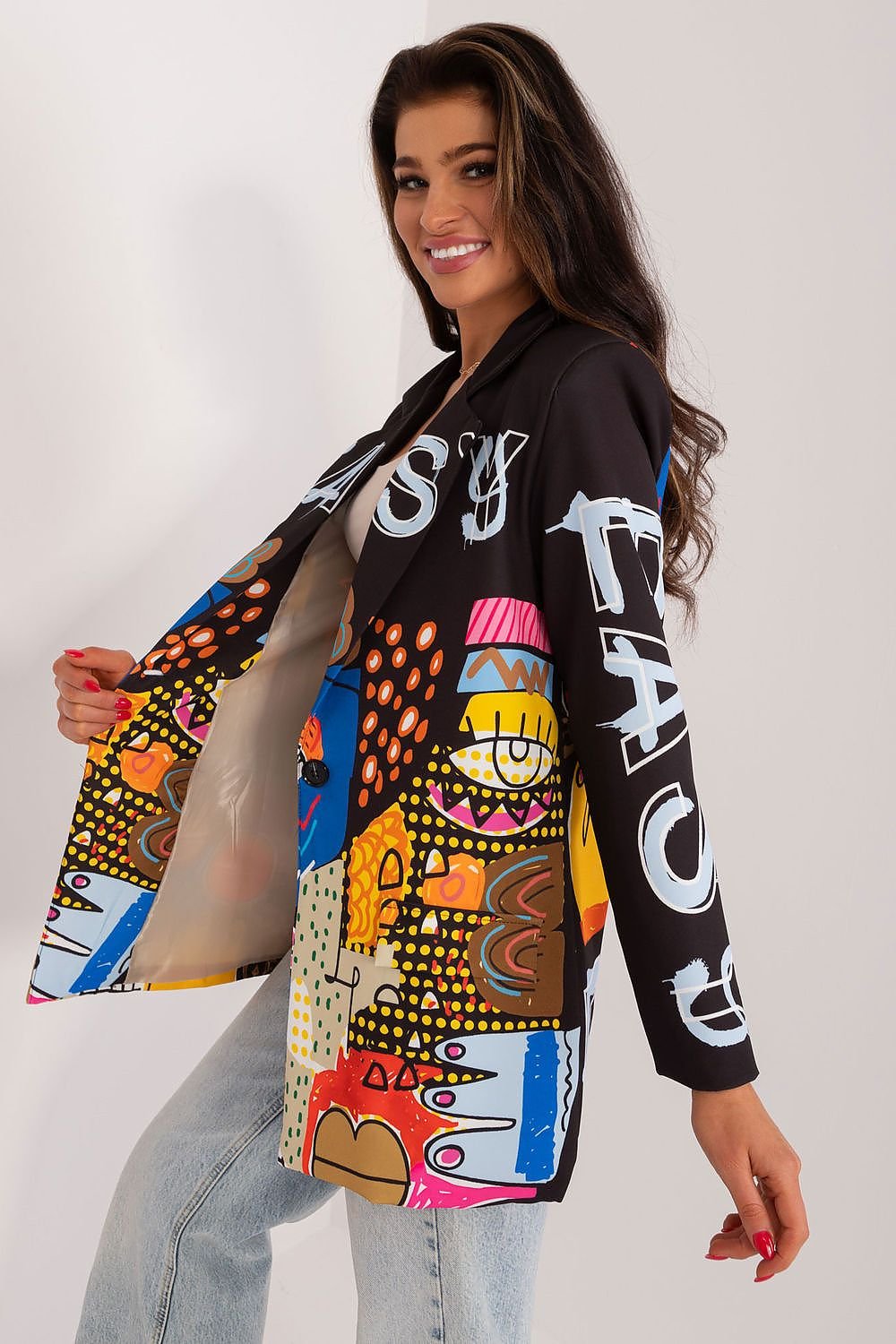 This women's blazer is the perfect garment for combining elegance with modern style. Its predominant pattern is a colorful print that adds originality and freshness to the overall look. It is the perfect choice for both parties and everyday wear. Made primarily of polyester, the jacket offers lightness and comfort, making it perfect for the spring/summer season. The standard length and long sleeves add an elegant touch and make it a versatile choice for a variety of occasions. The practical button closure adds a touch of chic and highlights the feminine silhouette. The jacket is lined for added comfort. The wide lapels add character and a modern twist to the overall look. Thanks to its versatility, this jacket is suitable for both elegant outings and casual gatherings, highlighting the wearer's individual style. A combination of style, comfort, and originality that is sure to turn heads.
