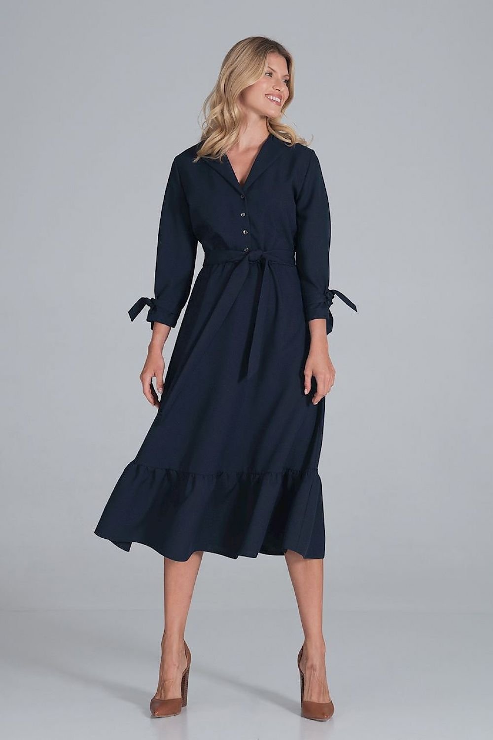 Maxikleid in der Taille mit Gummizug abgeschnitten. Der untere Teil ist ausgestellt und hat eine Rüsche, einen kleinen Ausschnitt mit Revers, der auf halber Höhe geknöpft wird. Ärmel 7/8 mit einer Schärpe gebunden, seitlich mit Reißverschluss.