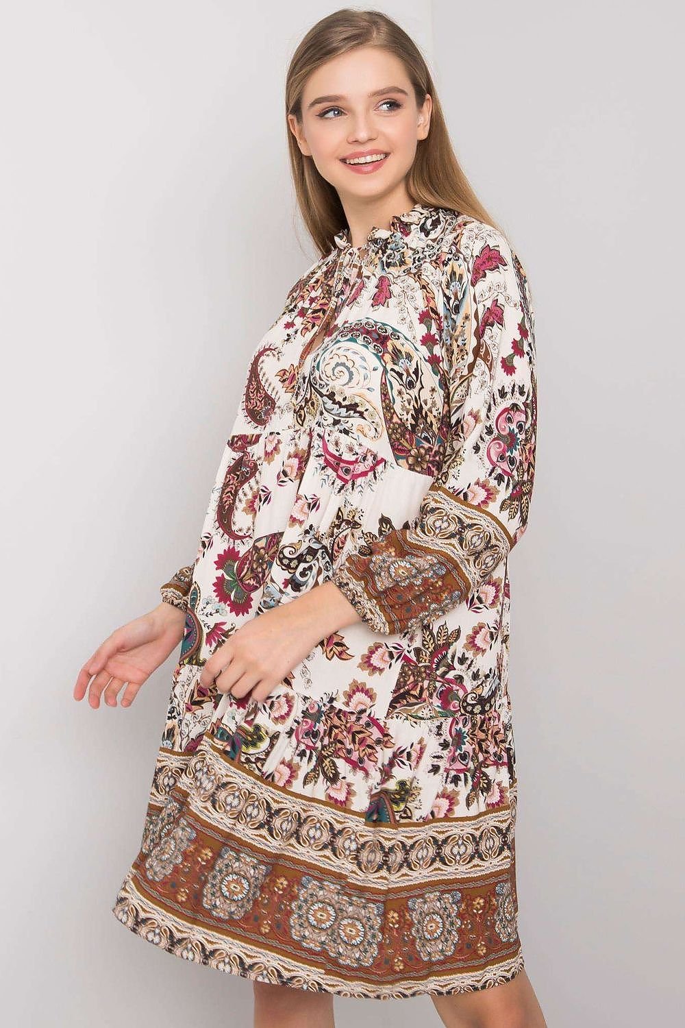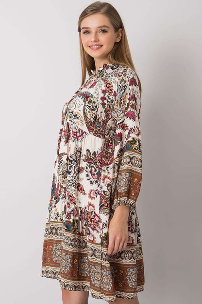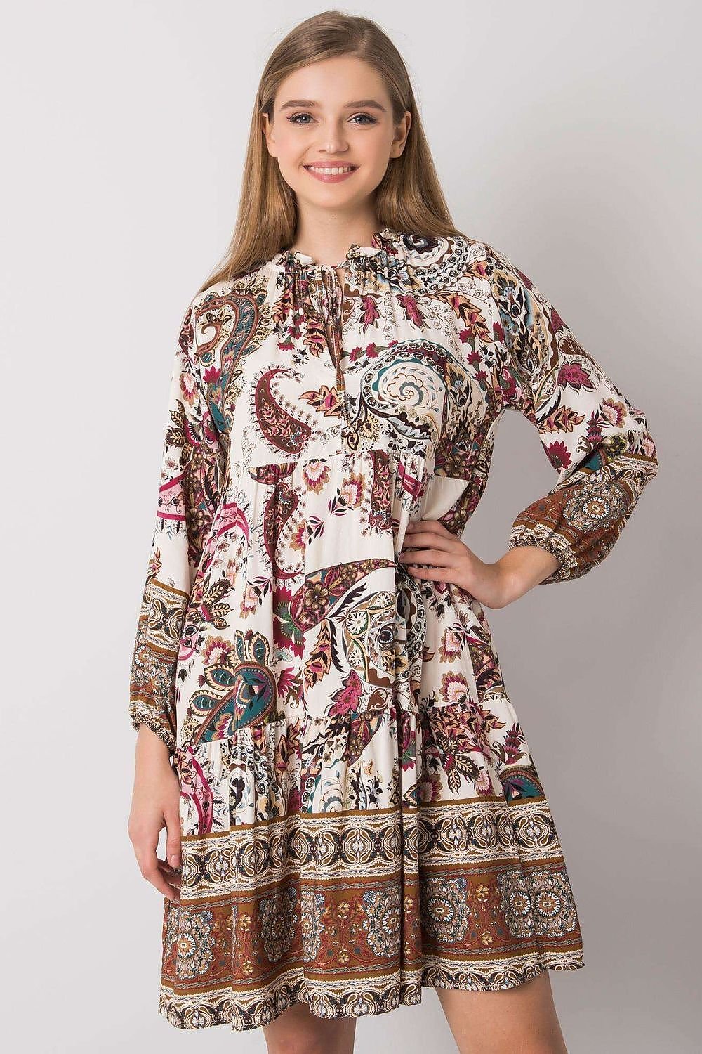 Gemustertes Kleid mit langen Ärmeln und Rundhalsausschnitt. Locker geschnittenes Kleid, ideal für viele Gelegenheiten.