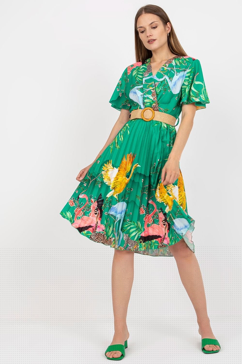 Sommerkleid mit kurzen Ärmeln, Rundhalsausschnitt und ausgestelltem Unterteil. Falten im unteren Teil des Kleides. Kleid mit geflochtenem Gürtel inklusive. Ideal für viele Gelegenheiten.
