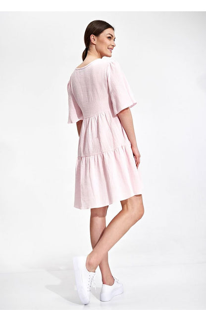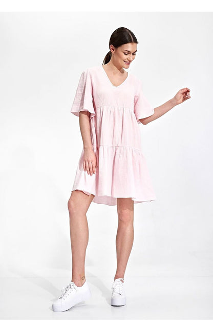 Sommerliches, ausgestelltes Minikleid mit Rüschen. Kleid mit kurzen, ausgestellten Ärmeln. Das Kleid hat kein Futter und keine Taschen.