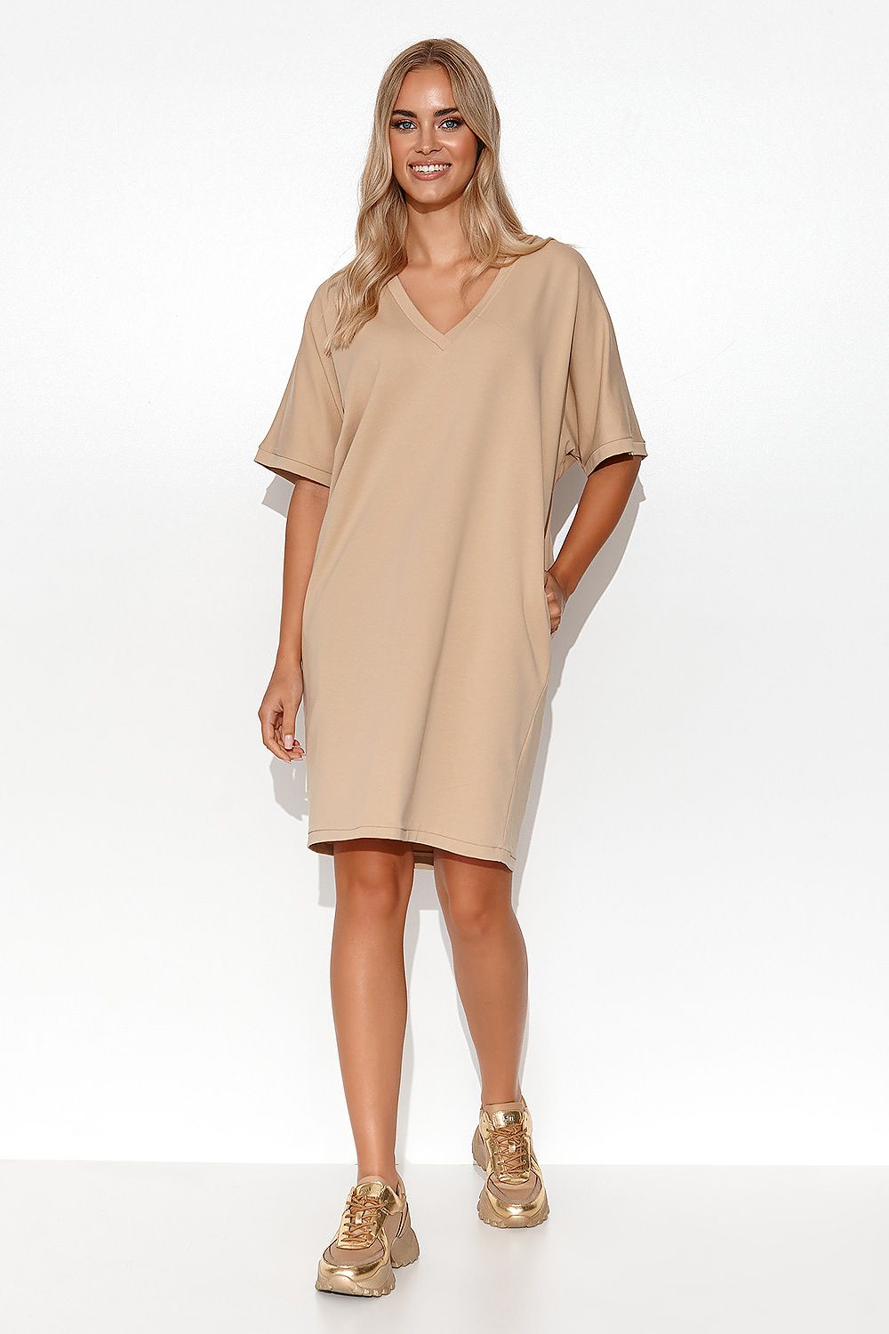 Ein extrem lässiges, minimalistisches Sweatshirt-Kimonokleid. Seine Länge betont die Beine, sodass es perfekt zu Stiefeln passt. Der freche Ausschnitt legt die Schlüsselbeine frei und schafft Platz für schönen Schmuck. An den Seiten befinden sich Eingrifftaschen. Das Kleid bietet viel Bewegungsfreiheit. Damen mit einer Apfelform werden sich darin wohlfühlen. Das Kleid kaschiert den Bauchbereich und verlängert optisch den Hals. Kurze Kimonoärmel verhindern, dass die Unterwäsche zu sehen ist. Das lässt den Trainingsanzug feminin und adrett aussehen.