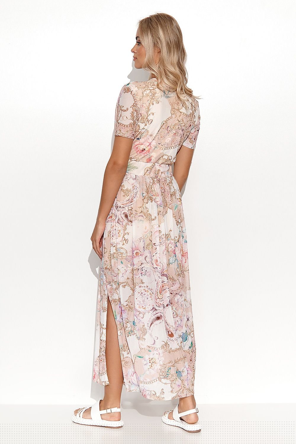 Ein langes, ätherisches, feminines Kleid, das in vier Varianten erhältlich ist, die sich in Muster und Farbe unterscheiden. Sie können zwischen floralen, tierischen und abstrakten Motiven wählen. Der obere Teil des Kleides ist aus einem dünnen Netzstoff genäht. Dies verleiht dem Kleid eine ungewöhnliche Raffinesse. Darunter befindet sich ein minilanger Petticoat. Das Kleid hat kurze Ärmel und einen sinnlichen Umschlagausschnitt, der die Büste betont. Außerdem hat die Kreation einen dicken, elastischen Taillenbund. Im unteren Bereich ist ein praktischer Schlitz vorhanden. Kombinieren Sie es mit sommerlichen Sandalen oder eleganten Stilettos. Ergänzen Sie es mit einem Strohhut und genießen Sie den Sommer mit Stil.