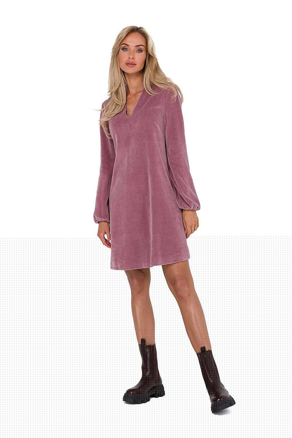 Kleid aus Velours mit langen Ärmeln und einem V-Ausschnitt. Das Kleid hat einen Trapezschnitt, ungefüttert. Entworfen und genäht in Polen.