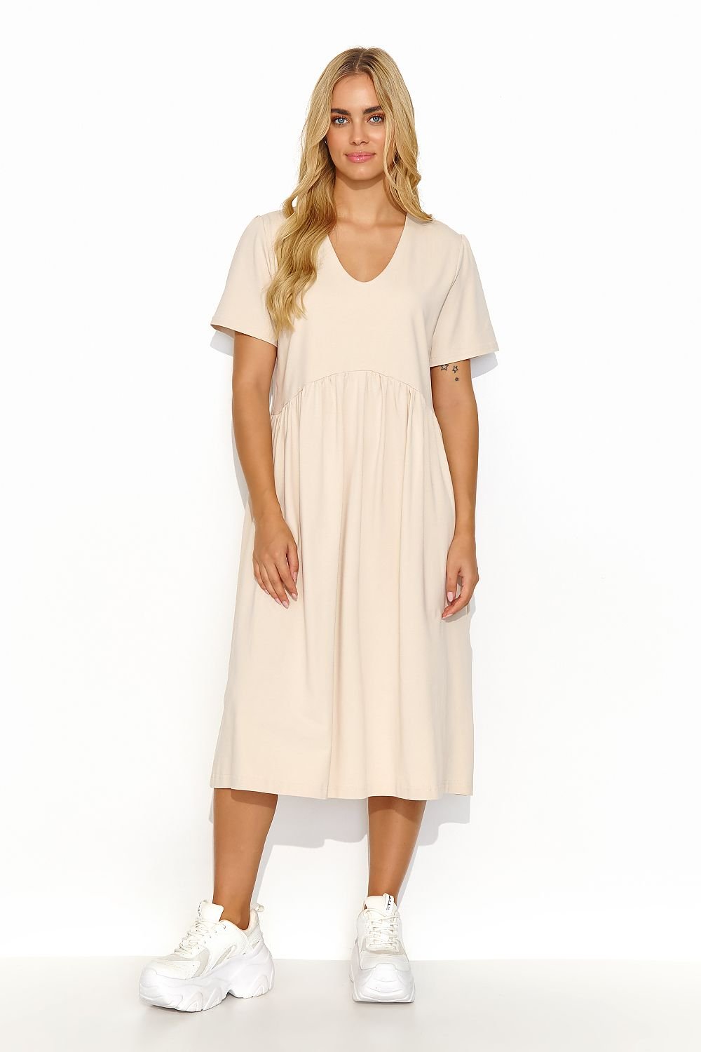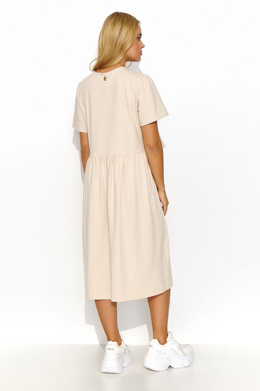 Dieses knielange, kurzärmelige Kleid ist ideal für eine Vielzahl von Anlässen und bietet nicht nur Komfort, sondern auch einen stilvollen Look. Es hat einen herzförmigen Ausschnitt, der dem Kleid einen subtilen und femininen Charme verleiht und gleichzeitig den Hals betont. Unter der Brust ist es leicht gestrafft und betont die Taille, was der Kreation einen zarten und formellen Charakter verleiht. Der lockere Schnitt sorgt für ganztägigen Tragekomfort und lässt das Kleid leicht und mädchenhaft wirken. Ein Goldplättchen am Rücken verleiht dem Kleid einen funkelnden Schmuck, der es von der Masse abhebt. Erhältlich in den Farben Mokka, Hellbeige, Schoko und Schwarz, können Sie mit diesem Kleid für jedes Outfit und jeden Anlass den richtigen Farbton wählen. Perfekt für viele Anlässe, vom Stadtbummel über die Arbeit bis zum Treffen mit Freunden. Dieses Kleid sorgt dafür, dass Sie nicht nur modisch, sondern auch bequem und selbstbewusst den ganzen Tag über aussehen.