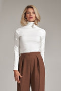 Klassische ecrufarbene Bluse mit Rollkragen und langen Ärmeln.