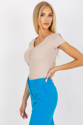 Kurzärmelige Bluse mit herzförmigem Ausschnitt und Bügelfalte auf der Vorderseite. Rückseite mit durchbrochenem Einsatz verziert.