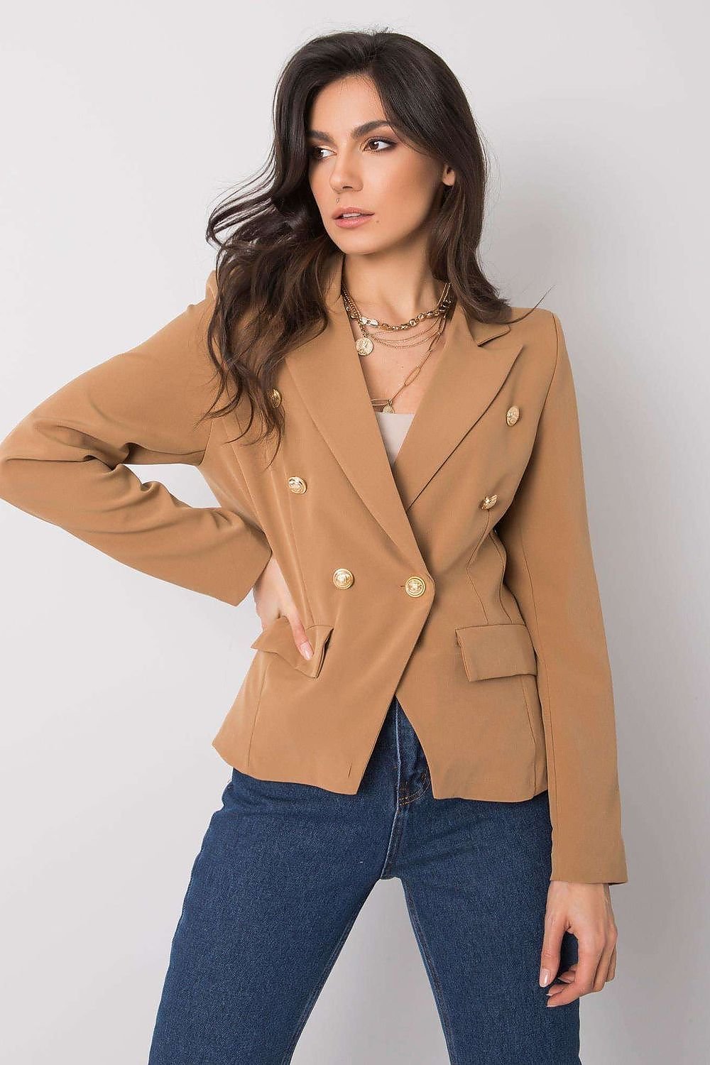 Kamelfarbene Damenjacke mit Knopfverschluss. Auf die Schultern genähte Kissen.