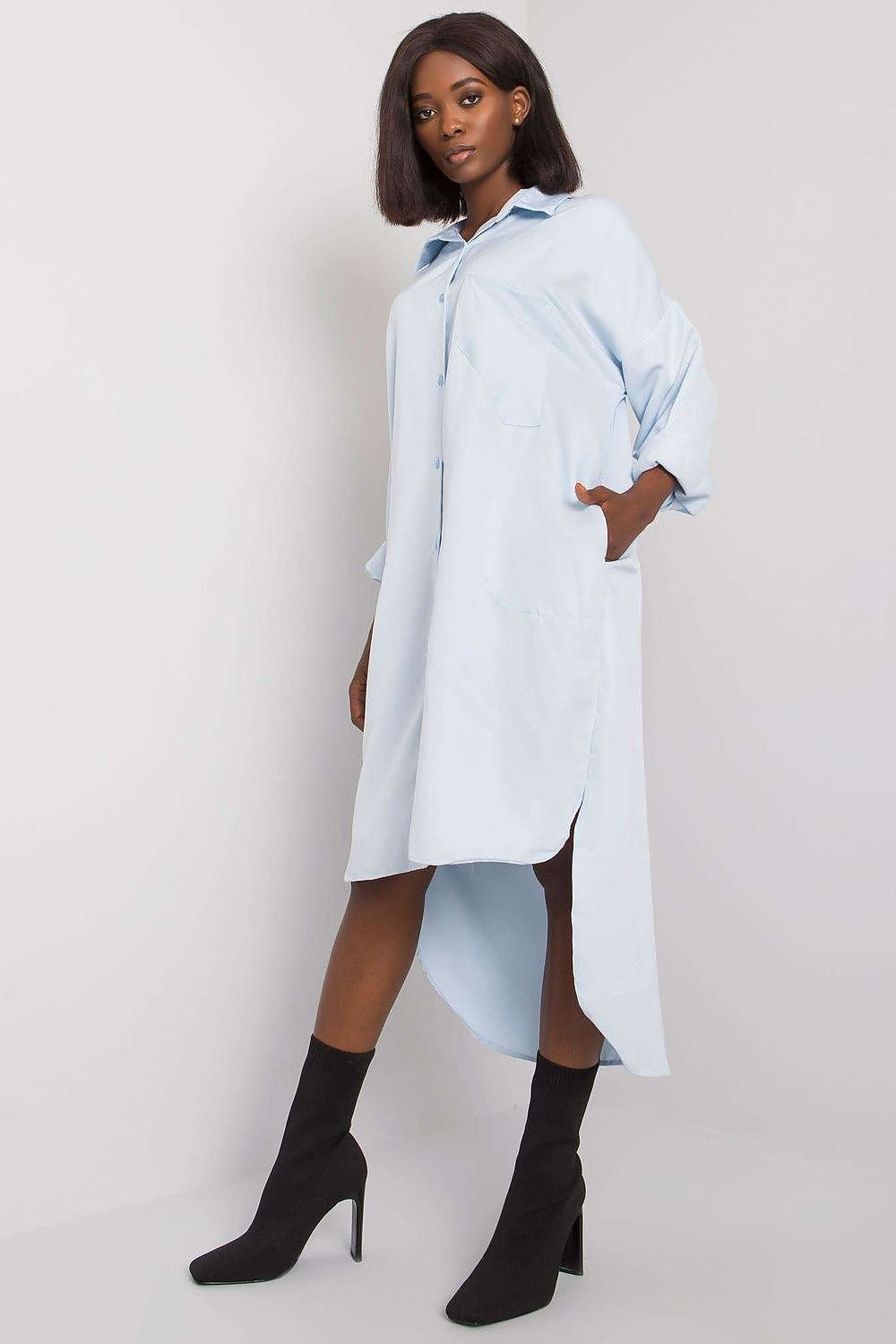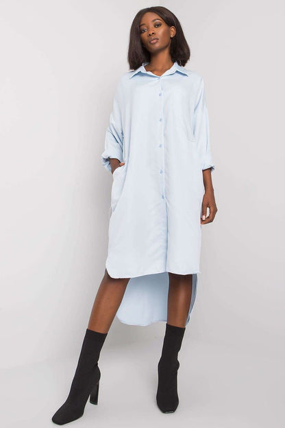Hellblaues Damenhemd mit Seitentaschen. Langärmeliges Hemd mit Knopfleiste. Verlängerter Rücken. Das Shirt kann mit Leggings oder als eigenständiges Kleid getragen werden.