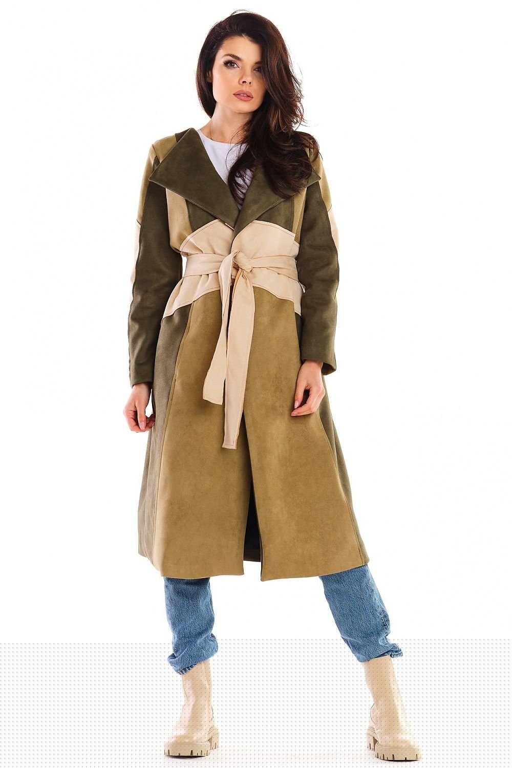 Längerer Damenmantel aus Wildleder. Der Mantel ist aus einer modischen Farbkombination in Herbstfarben gefertigt. Es hat keinen Verschluss, aber einen zusätzlichen Gürtel, mit dem Sie es in der Taille binden und Ihre Taille betonen können. Eignet sich sowohl für elegante als auch für legere Outfits. Hergestellt in Polen.
