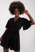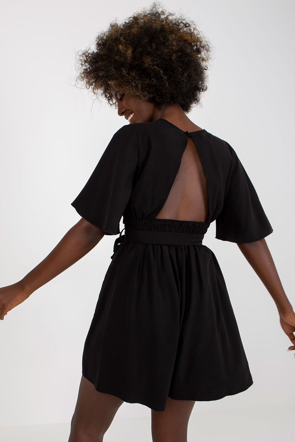 Eleganter Jumpsuit mit weiten kurzen Ärmeln. Ausschnitt, in der Taille gebunden, Zierfalte im Rücken, Verschluss im Nacken.