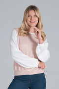 Zweifarbiger warmer Pullover mit langen Ärmeln. Ausgestellte Ärmel mit geripptem Saum.