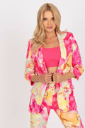 Gerade geschnittene Jacke aus farbigem Stoff mit Futter. Polsterungen und Falten an den Schultern. Jacke mit 3/4 Ärmeln, ohne Knopf. Eine Hose in der gleichen Farbe passt zum Set.