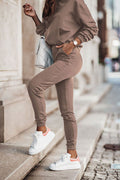 Gemeinsam oder getrennt? Sie entscheiden! Unsere Jogginghosen-Sets wurden nach dem Prinzip "mix and match" nach Lust und Laune zusammengestellt. Das klassische Trainingsanzug-Set aus angenehmem, hochwertigem Strick ist eine ideale Wahl für alle Frauen, die sich in einem Trainingsanzug wohlfühlen und gleichzeitig stylisch aussehen wollen - ja, das ist möglich! Das Oberteil des Sweatshirts ist ein Kapuzensweatshirt mit einer Kängurutasche für Ihr Handy oder Ihre Brieftasche. Die langen Ärmel können hochgekrempelt werden und sind mit einem Gummizug versehen. Das Sweatshirt passt perfekt zu Jeans mit hoher Taille oder einem klassischen Röhrenrock. Die Hose hat schlanke, lange Beine, die Ihre Figur betonen und Sie sich in unserem Trainingsanzug sehr feminin fühlen lassen. Sie haben einen Kordelzug an Taille und Beinen. Die Hose passt perfekt zu einem Denim-Katana und Sneakers. Die angegebene Länge bezieht sich auf das Sweatshirt.