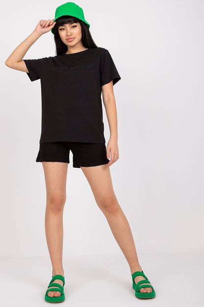 Set bestehend aus einer Bluse und Shorts. Bluse mit kurzen Ärmeln, Aufschrift auf der Vorderseite. Kurze Hose mit Bindegürtel, schräge Seitentaschen.