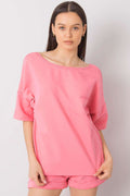 Baumwollset bestehend aus einer Bluse und Shorts. Locker geschnittene Bluse mit kurzen Ärmeln. Kurze Hose mit Gummizug und Bindeband in der Taille. Aufgesetzte Taschen an den Seiten.