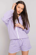 Trainingsanzug bestehend aus einem Sweatshirt und einer kurzen Hose. Sweatshirt mit Reißverschluss und Kapuze. Kurze Hose mit Gummizug und Bindeband in der Taille, Seitentaschen.