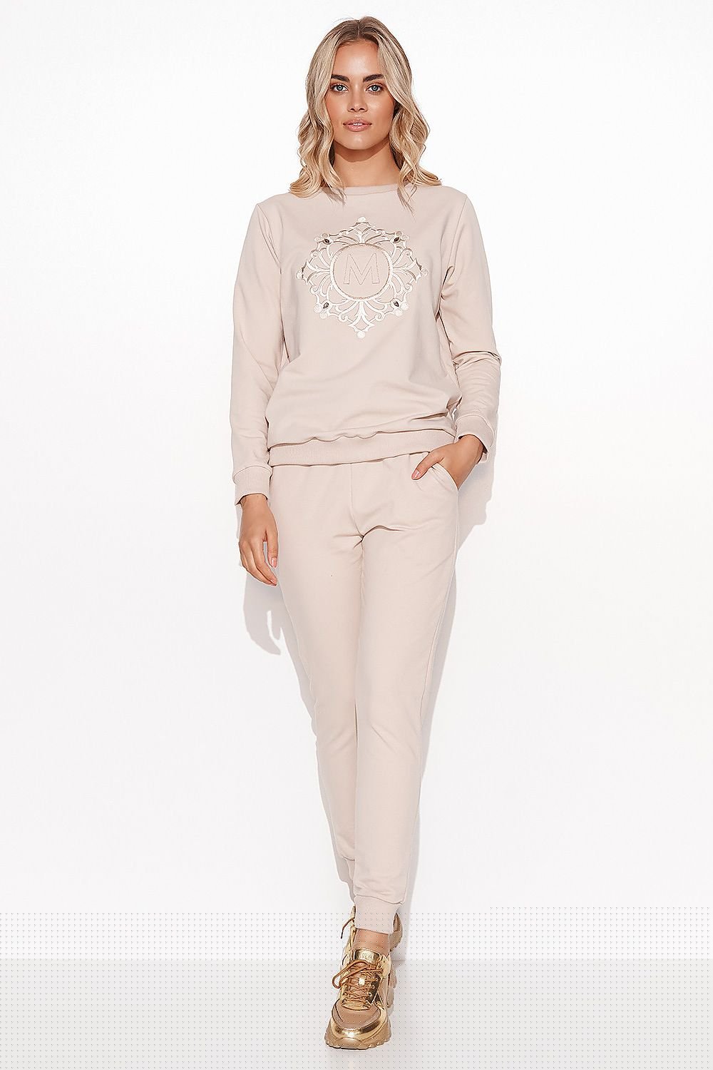 Damen-Trainingsanzug-Set, genäht aus einem klassischen Sweatshirt-Strick. Das Set besteht aus einem Sweatshirt, das über den Kopf gestülpt wird, und einer langbeinigen Hose. Das Sweatshirt hat lange Ärmel und einen runden, etwas tieferen Ausschnitt. Auf der Vorderseite des Sweatshirts befindet sich eine Applikation mit dem Buchstaben M und mehreren tränenförmigen Kristallen. An den strategischen Stellen des Sweatshirts sind Nähte eingenäht. Diese finden sich auch am distalen Teil der Beine und an der Taillenlinie der Hosen. Die langen Hosen haben einen geraden Schnitt, ohne dekorative Elemente. Sie haben zwei praktische Schlupftaschen an den Seiten. Das Set ist sehr bequem und elegant.
