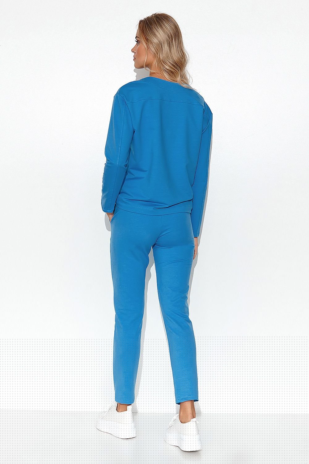Elegantes Trainingsanzug-Set für Damen. Die minimalistische Bluse hat einen tiefen V-Ausschnitt, lange Ärmel und interessante modellierende Nähte. Auf der Vorderseite ist ein zarter Aufnäher mit dem Buchstaben M aufgenäht. Die Damenbluse sieht an der Silhouette äußerst schick aus. Die Hose mit geradem Bein ist die perfekte Ergänzung. Auch sie ist mit Steppnähten versehen, um dem Set einen Business-Chic zu verleihen. An den Seiten befinden sich zugängliche Eingrifftaschen. In der Taille ist ein dicker elastischer Kordelzug eingenäht. Dadurch sitzt die Hose noch besser an der weiblichen Figur.