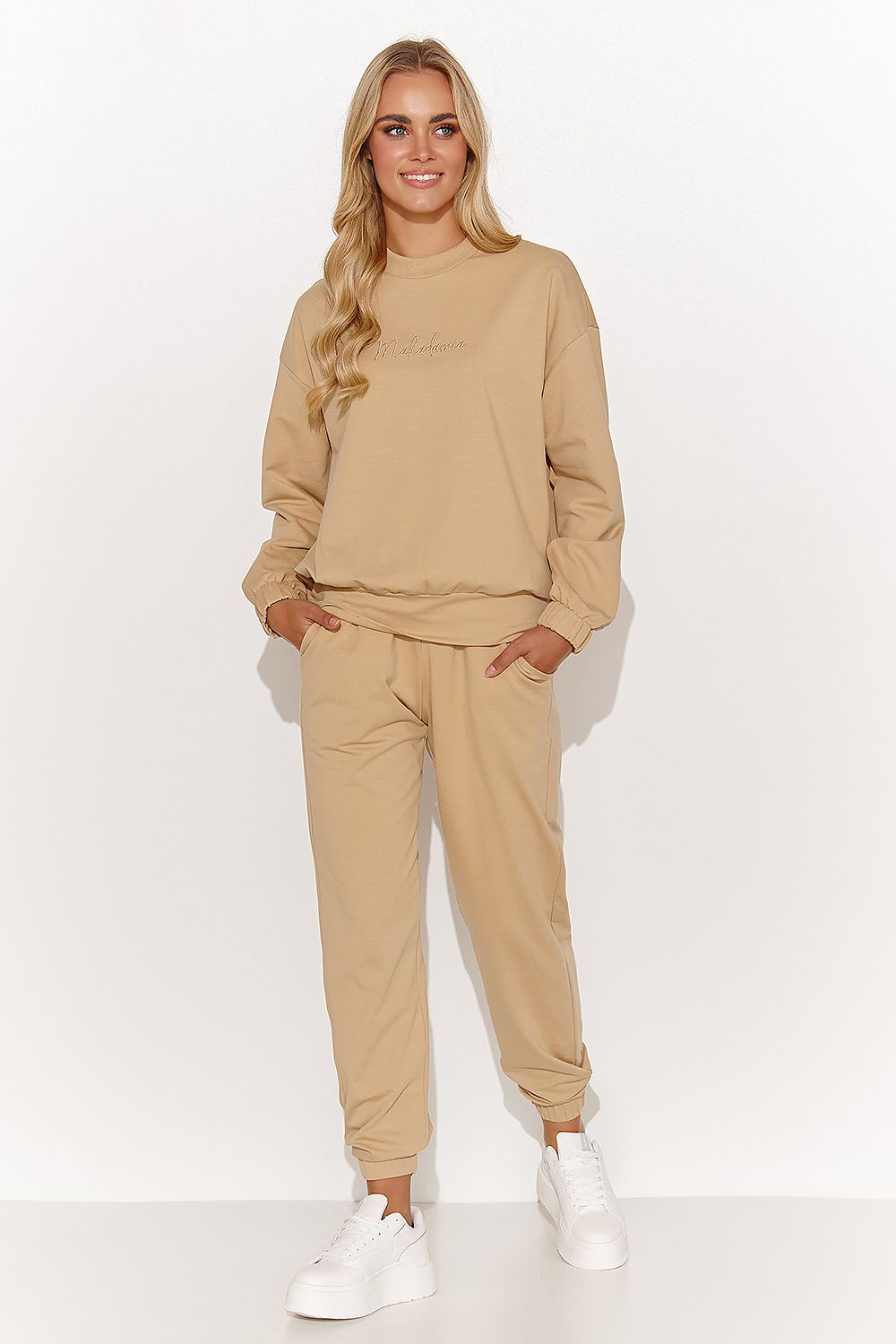 Das lässige Damen-Trainingsanzug-Set ist die perfekte Kombination aus Komfort und Stil. Das Sweatshirt, das Sie über den Kopf anziehen, hat lange Ärmel und einen Rundhalsausschnitt, der an kälteren Tagen gut funktioniert. Die Rippenbündchen an den Ärmelenden und am unteren Ende des Sweatshirts sind ein praktisches Element. Auf der Vorderseite des Sweatshirts befindet sich eine dezente Stickerei mit dem Wort Macadamia, die einen Hauch von Eleganz verleiht. Die Hose mit langem Bein ist dank ihres bequemen Schnitts und der Seitentaschen praktisch. Das reguläre Bein ist mit einem Standard-Kordelzug am Saum versehen. Erhältlich in den Farben Sand, Chocolate und Schwarz, ist dieses Set die perfekte Wahl für den Alltag und die Arbeit. Es verleiht einen femininen Touch und sorgt für Komfort den ganzen Tag lang.