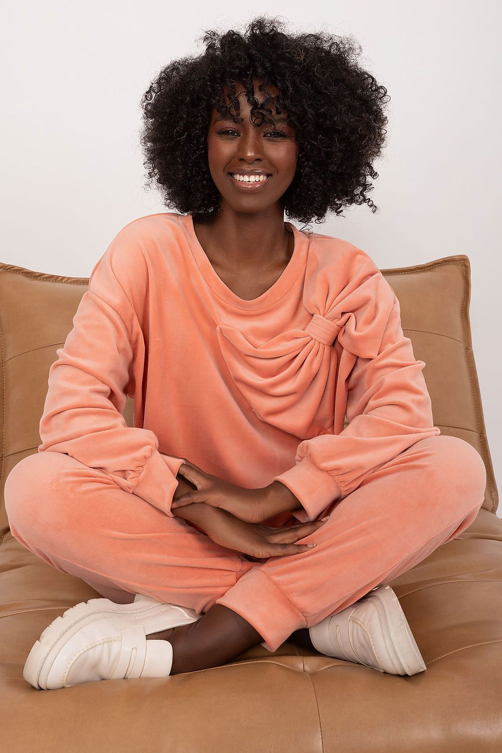 Das Set aus Velours-Sweatshirt und -Hose ist die perfekte Wahl für alle, die die Kombination aus Komfort und lässigem Stil schätzen. Dieses Set wurde für den Alltag entwickelt und bietet nicht nur Tragekomfort, sondern auch einen modischen Look. Das vorherrschende Material ist glattes Polyester, das dem Set ein elegantes Finish verleiht und für ein angenehmes Tragegefühl auf der Haut sorgt. Die Standardlänge von Bluse und Hose macht das Set praktisch und vielseitig, ideal für verschiedene Anlässe. Die Hosenbeine sind mit gerippten Abschlüssen versehen, die für einen modernen, leicht sportlichen Look sorgen. Die hoch taillierte Hose betont die Silhouette und setzt einen modischen Akzent. Praktisch sind die seitlichen Eingrifftaschen in der Hose, in denen kleine Gegenstände verstaut werden können. Die Bluse mit langen Ärmeln und Rundhalsausschnitt ist bequem und alltagstauglich. Ein zusätzliches Zierelement in Form einer Schleife auf der Vorderseite des Sweatshirts sorgt für einen dezenten Charme und macht das Set noch attraktiver. Dieses Set aus Sweatshirt und Hose kombiniert einen lässigen Stil mit einer modernen, bequemen Passform und ist somit die perfekte Wahl für einen aktiven Tag voller Komfort und einem modischen Look.
