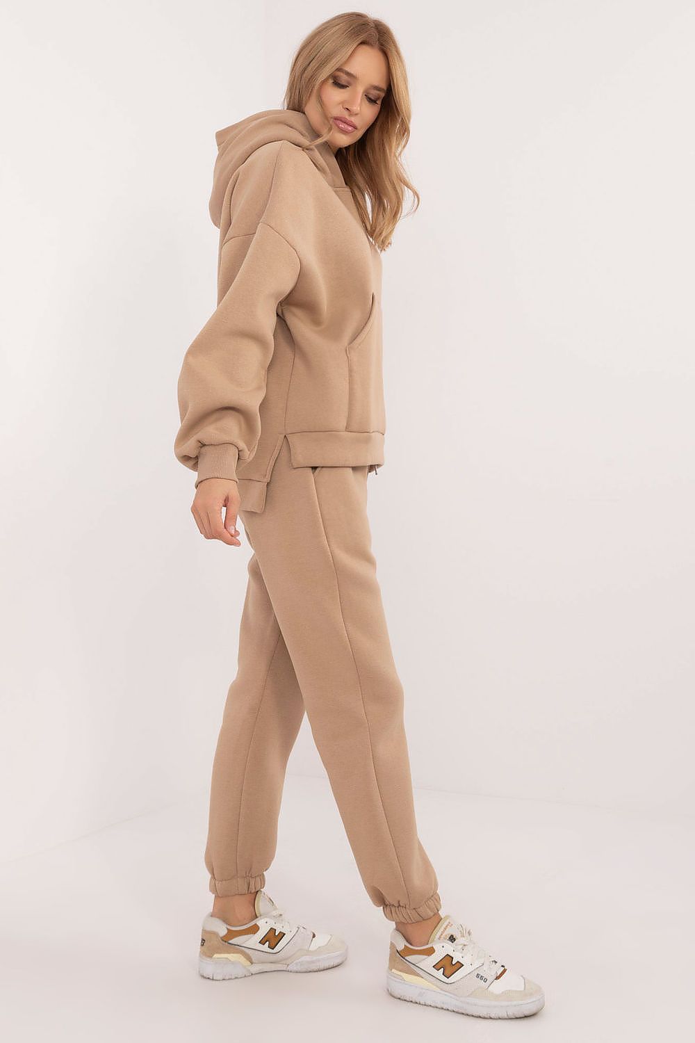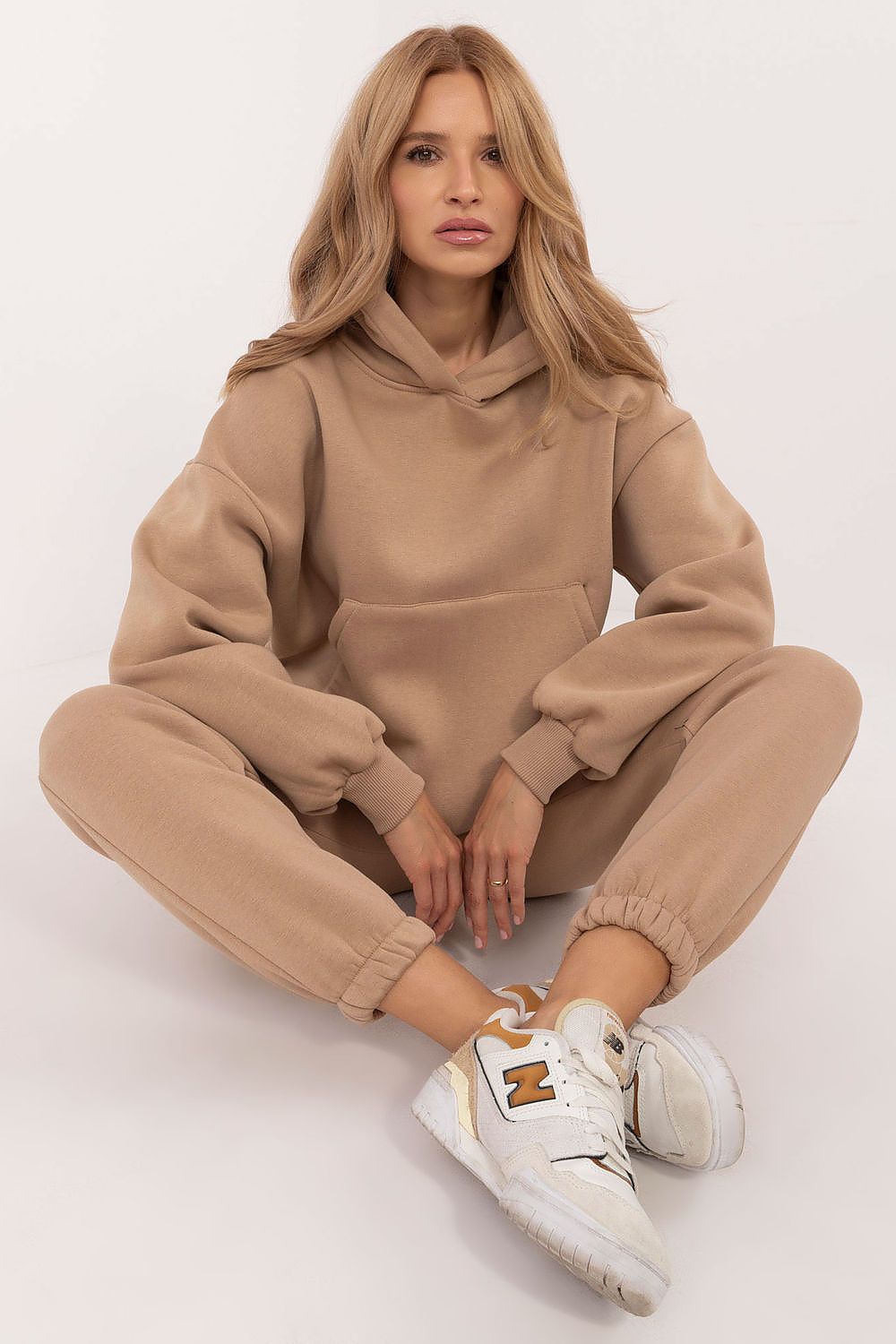 Ein warmes, lässiges Damen-Sweatshirt-Set, ideal für die kälteren Tage des Alltags, besteht aus einem Sweatshirt und einer Hose. Das Set ist aus einem weichen und warmen Baumwoll-Polyester-Gemisch gefertigt, das für Komfort und Haltbarkeit sorgt. Das Sweatshirt hat lange Ärmel, eine Kapuze und eine große, praktische Kängurutasche, die für einen sportlichen Touch und Funktionalität sorgt. Dank der Isolierung ist das Sweatshirt ideal für kalte Tage, und sein unifarbenes Muster verleiht ihm einen klassischen, vielseitigen Look. Die Hose mit langen Beinen, die in Rippbündchen enden, hat einen hohen Bund, der die Taille betont und für Komfort sorgt. Ein Bindeband in der Taille sorgt für einen perfekten Sitz. Außerdem hat die Hose seitliche Eingrifftaschen, was sie zu einer praktischen Wahl für den Alltag macht. Das gesamte Set kombiniert Stil, Komfort und Wärme und ist die perfekte Wahl für ein lässiges Styling.