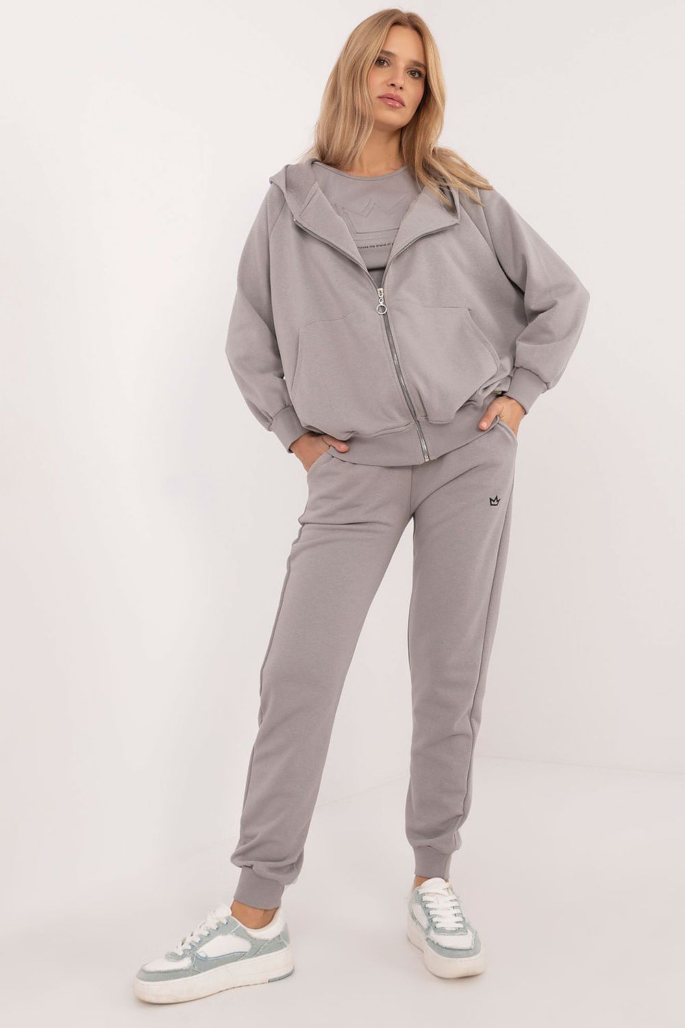 Damen-Jogginganzug im lässigen Stil, ideal für den täglichen Gebrauch sowie sportliche Aktivitäten, bestehend aus einem T-Shirt, einem Hoodie und einer Hose. Das Set hat ein glattes Muster, was ihm einen universellen Charakter verleiht, wobei das dominierende Material eine weiche und strapazierfähige Mischung aus Baumwolle und Polyester ist, die Komfort und Atmungsaktivität bietet. Die Hose hat lange Beine mit Bündchen am Ende und eine hohe Taille, die die Silhouette betont und volle Bewegungsfreiheit bietet. In der Taille befindet sich ein elastischer Bund, der für eine perfekte Passform sorgt. Zusätzlich haben die Hosen seitliche Einschubtaschen, die praktisch und funktional sind. Der Hoodie mit langen Ärmeln und Reißverschluss ist mit Einschubtaschen und einer Kapuze ausgestattet, was einen sportlichen Stil verleiht und vor Kälte schützt. Das T-Shirt mit klassischem Rundhalsausschnitt ist die perfekte Ergänzung des Sets. Dieser Anzug ist eine Kombination aus Komfort, Funktionalität und Stil, ideal für jeden Tag und sportliche Aktivitäten.