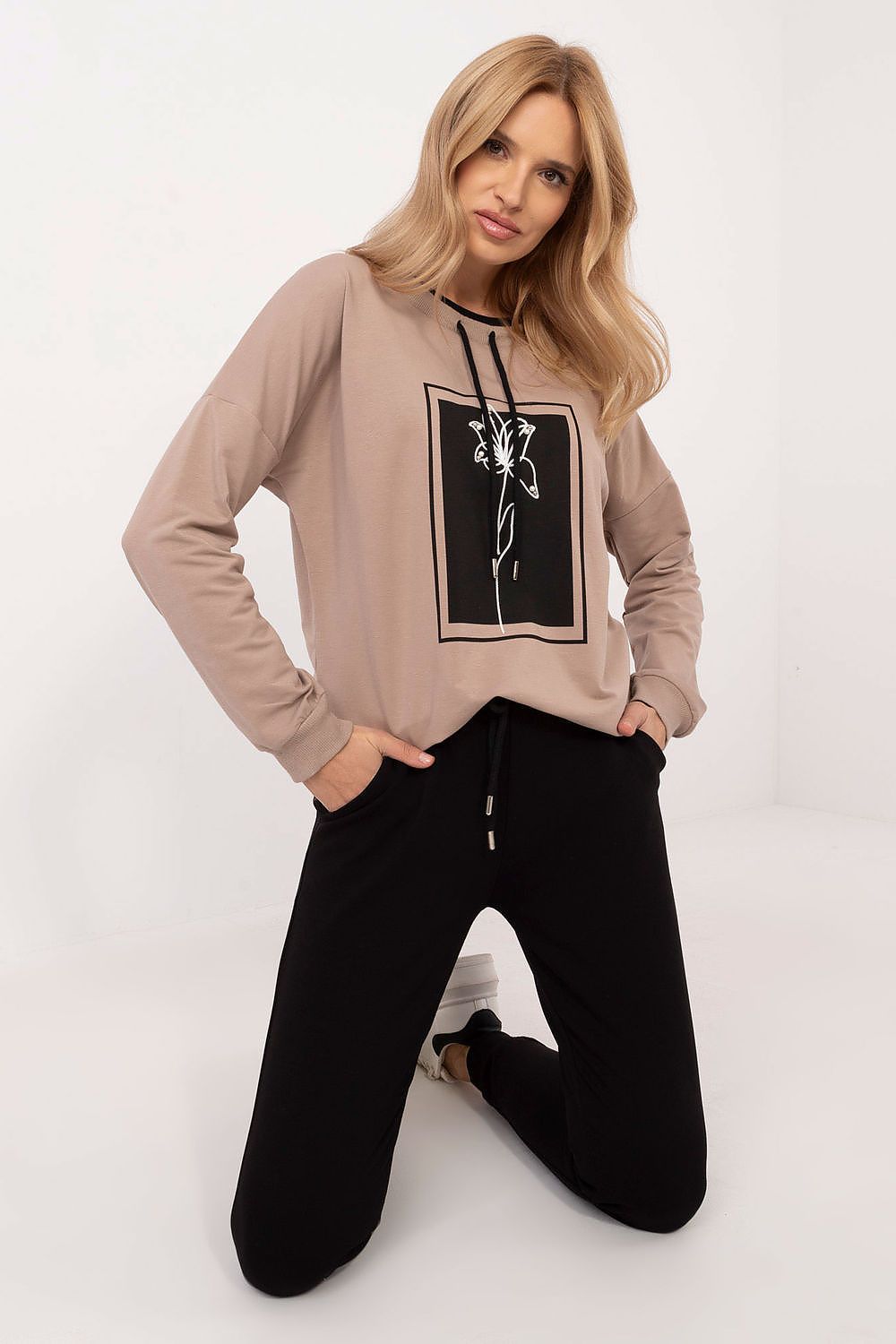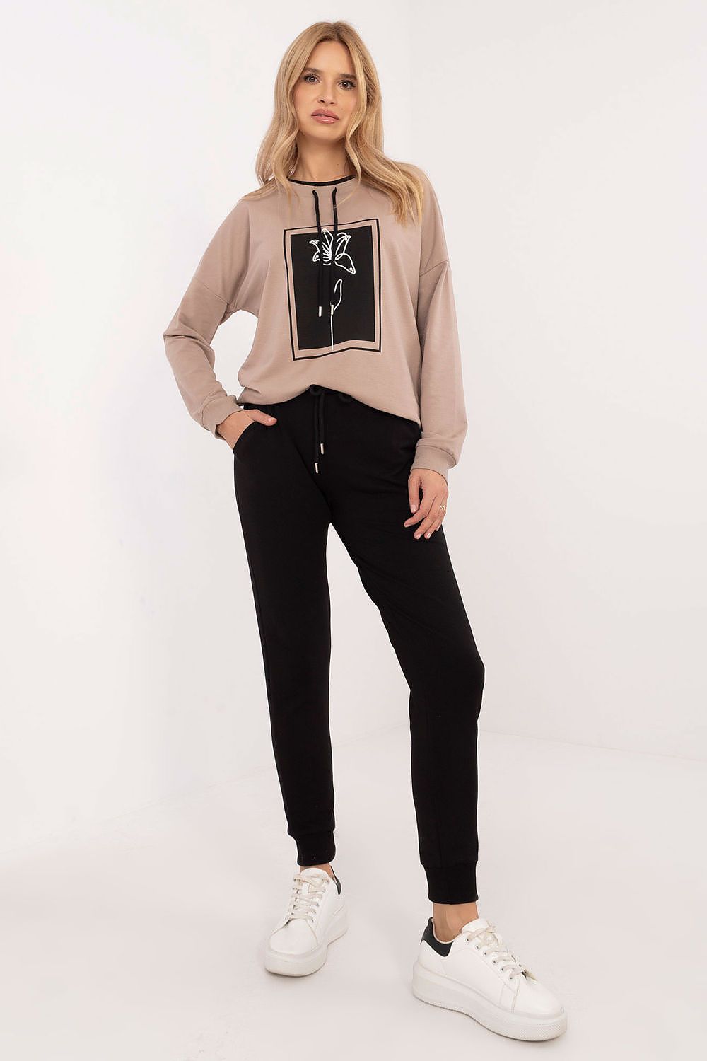 Lässiges Damen-Set bestehend aus einem Pullover und einer Hose, ideal für den Alltag. Hergestellt aus einer weichen Mischung aus Baumwolle und Elasthan, bietet es Komfort und Bewegungsfreiheit. Der Pullover hat lange Ärmel, einen Rundhalsausschnitt und einen modischen Aufdruck auf der Vorderseite, der ihm Charakter verleiht. Die lange Hose ist mit Bündchen an den Beinen versehen, was ihr ein sportliches Aussehen verleiht, und der hohe Bund betont die Taille. Darüber hinaus haben die Hosen seitliche Einschubtaschen, was ihre Funktionalität erhöht. Dieses glatte Set ist eine ausgezeichnete Wahl für Personen, die Komfort und Stil in ihren täglichen Outfits schätzen.