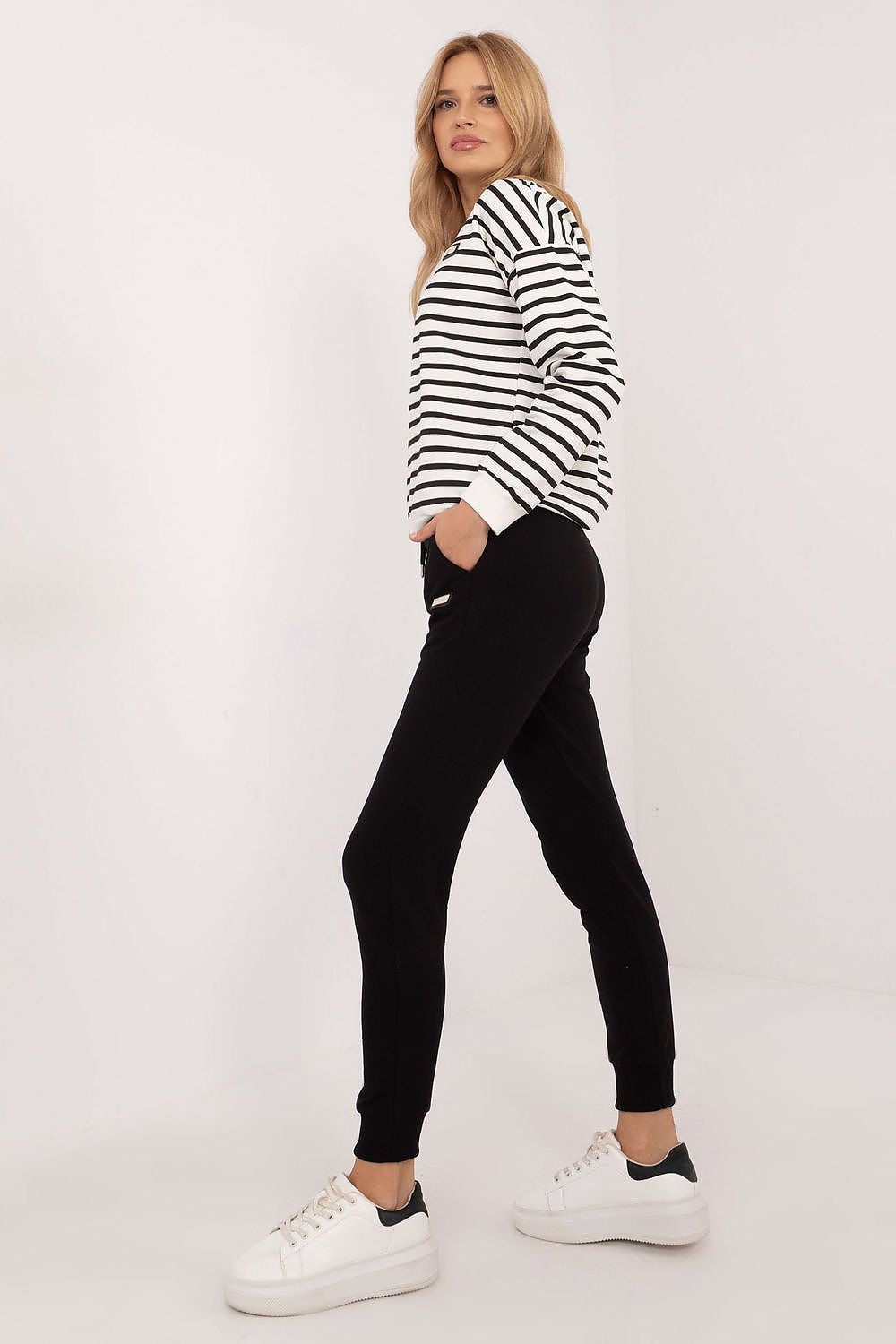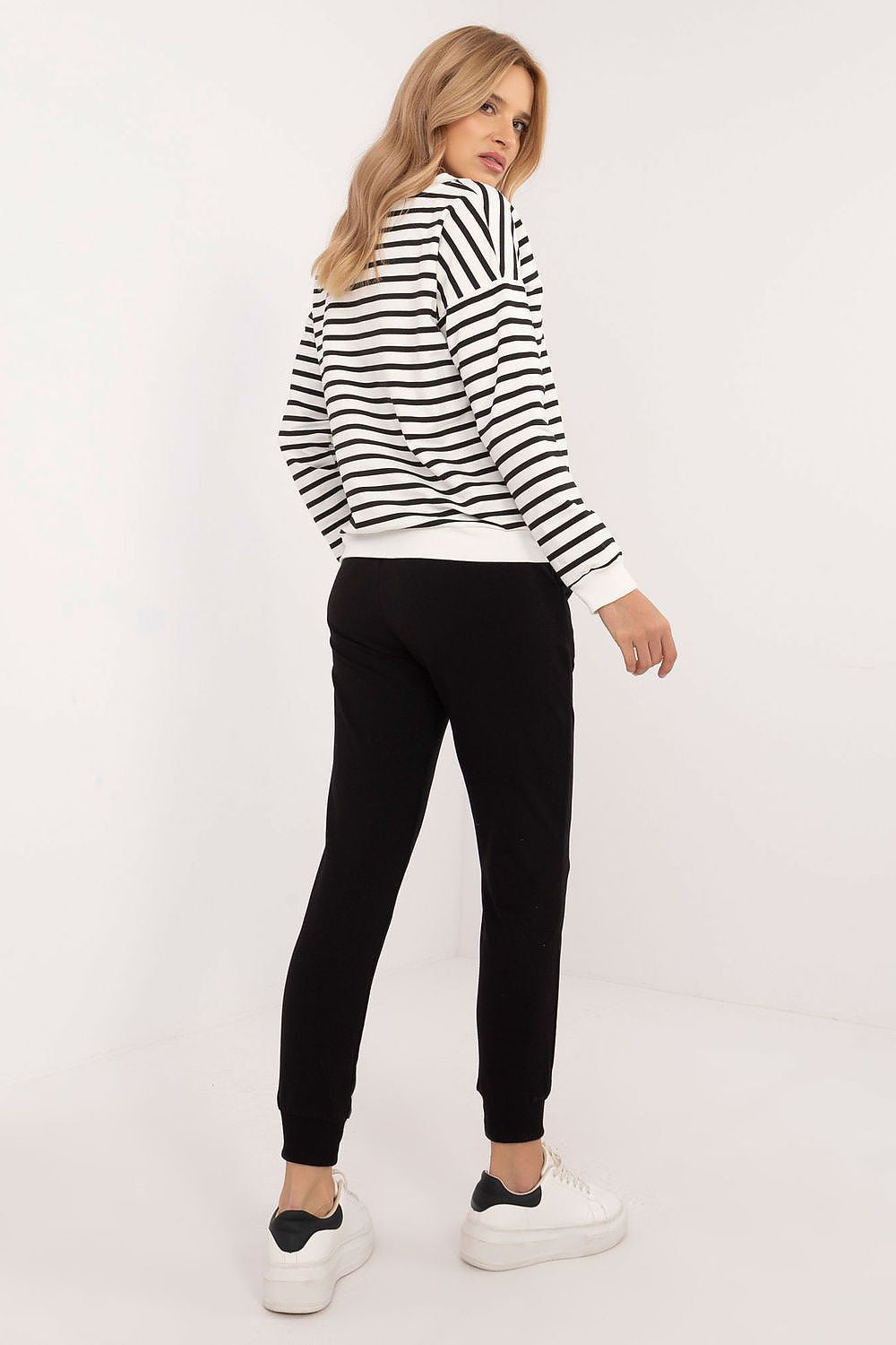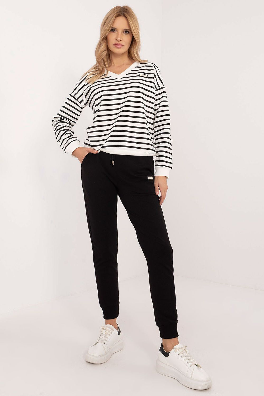 Damen-Sweatanzug: Sweatshirt und Hose im lässigen Stil, ideal für den Alltag. Hergestellt aus weicher, luftdurchlässiger Baumwollmischung mit Elasthan, die Komfort und perfekte Passform bietet. Das langärmelige Sweatshirt hat einen V-Ausschnitt und auf der Vorderseite befindet sich ein stilvolles Patch, das ihm Charakter verleiht. Die Hose hat eine hohe Taille und lange Beine mit Bündchen, die die Silhouette betonen und ein Verrutschen des Materials verhindern. In der Taille befindet sich eine praktische Schnürung zur Anpassung des Umfangs. Darüber hinaus sind die seitlichen Einschubtaschen ideal für Kleinigkeiten und das dezente Streifenmuster verleiht dem Anzug einen modischen, sportlichen Ausdruck.