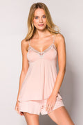 Zartes und feminines Set Verona. Das Set besteht aus einem Hemd mit dünnen Trägern und kurzen Shorts. Cups mit Spitze, Shorts mit Gummiband und Taschen.