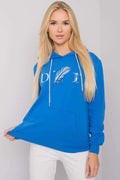 Dunkelblaues langärmeliges Känguru-Sweatshirt für Damen mit Kapuze.