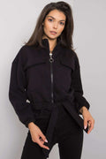 Schwarzes Damen-Sweatshirt mit Reißverschluss und langen Ärmeln. Taschen auf der Vorderseite und ein Band in der Taille.