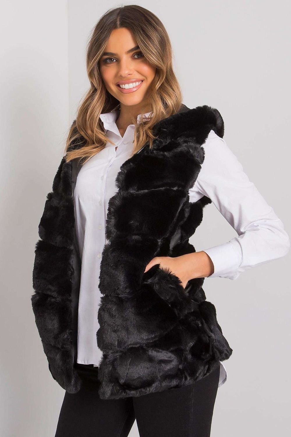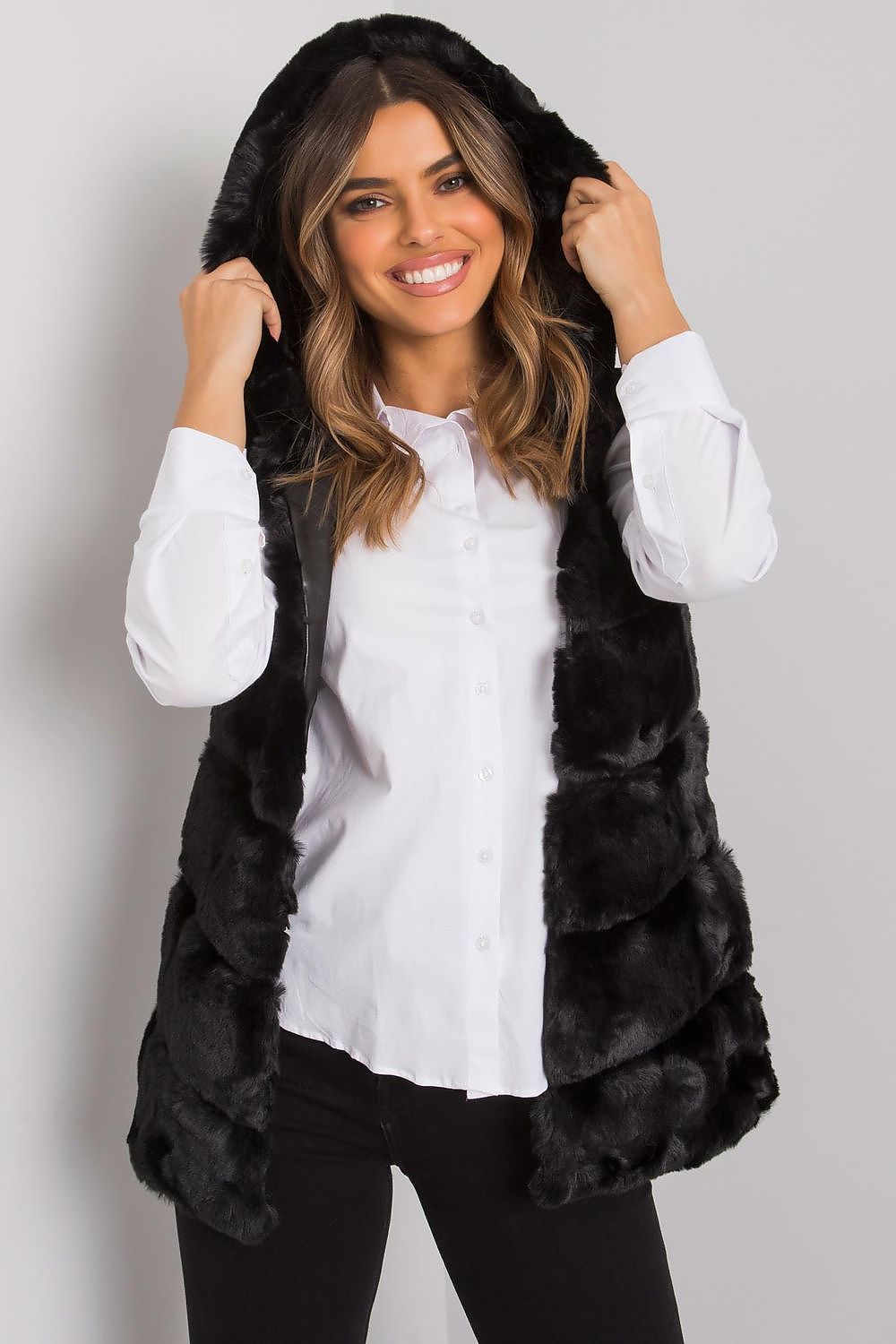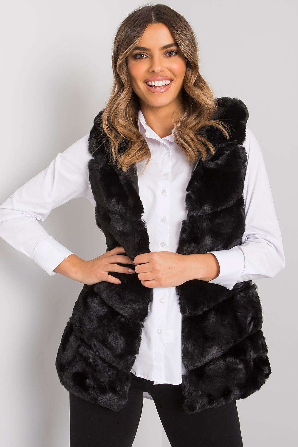 Schwarze Damenweste mit Kapuze. Die Weste wird mit Häkchen geschlossen und ist vollständig gefüttert.